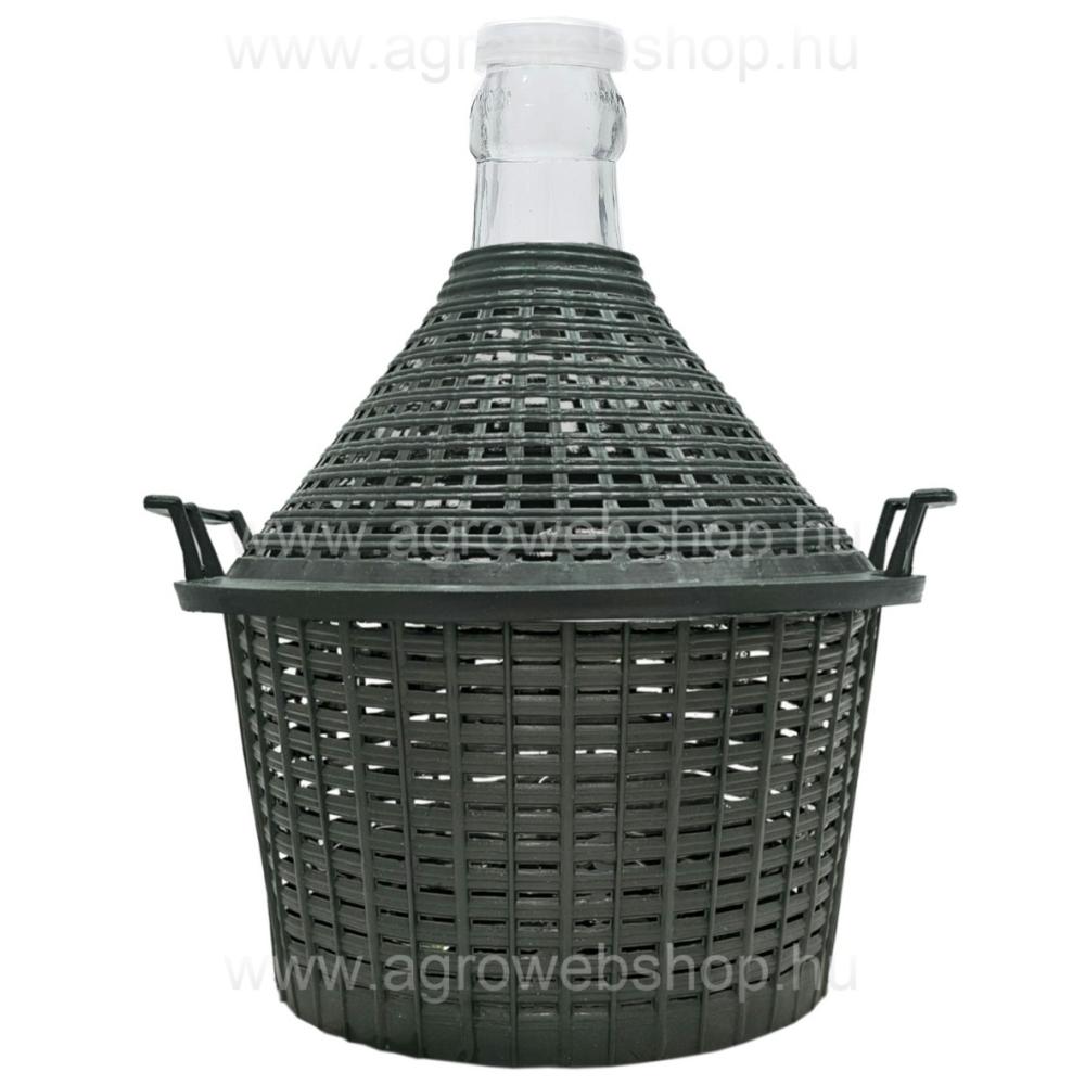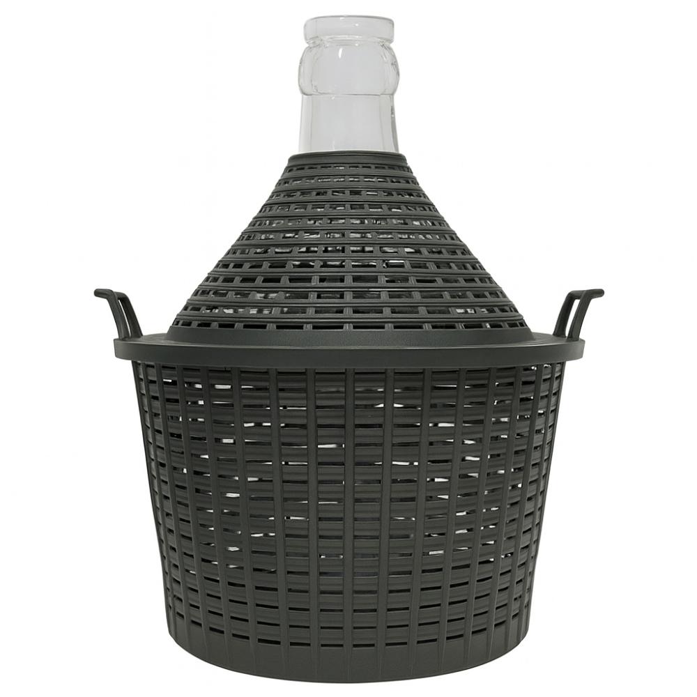 Olasz gyártású üveg demizson, levehető műanyagkosaras borítással. Demizsonüveg fehér, áttetsző, a ballonszáj vastag. A törés védelmet a leszedhető kétrészes műanyag kosár biztosítja. A kosár színe a képen látható sötét színű. A demizson műanyag burkolata leszedhető.