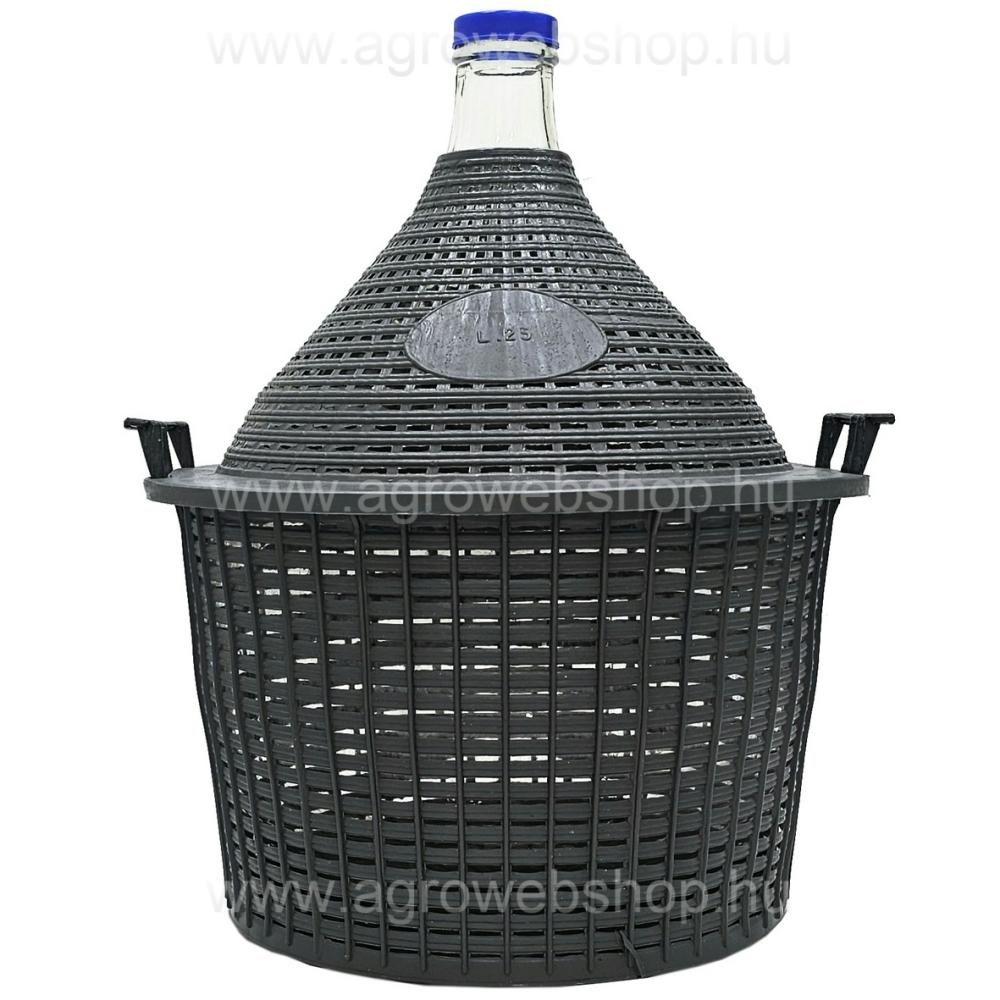Olasz gyártású üveg demizson, levehető műanyagkosaras borítással. Demizsonüveg fehér, áttetsző, a ballonszáj vastag. A törés védelmet a leszedhető kétrészes műanyag kosár biztosítja. A kosár színe a képen látható sötét színű. A demizson műanyag burkolata leszedhető.