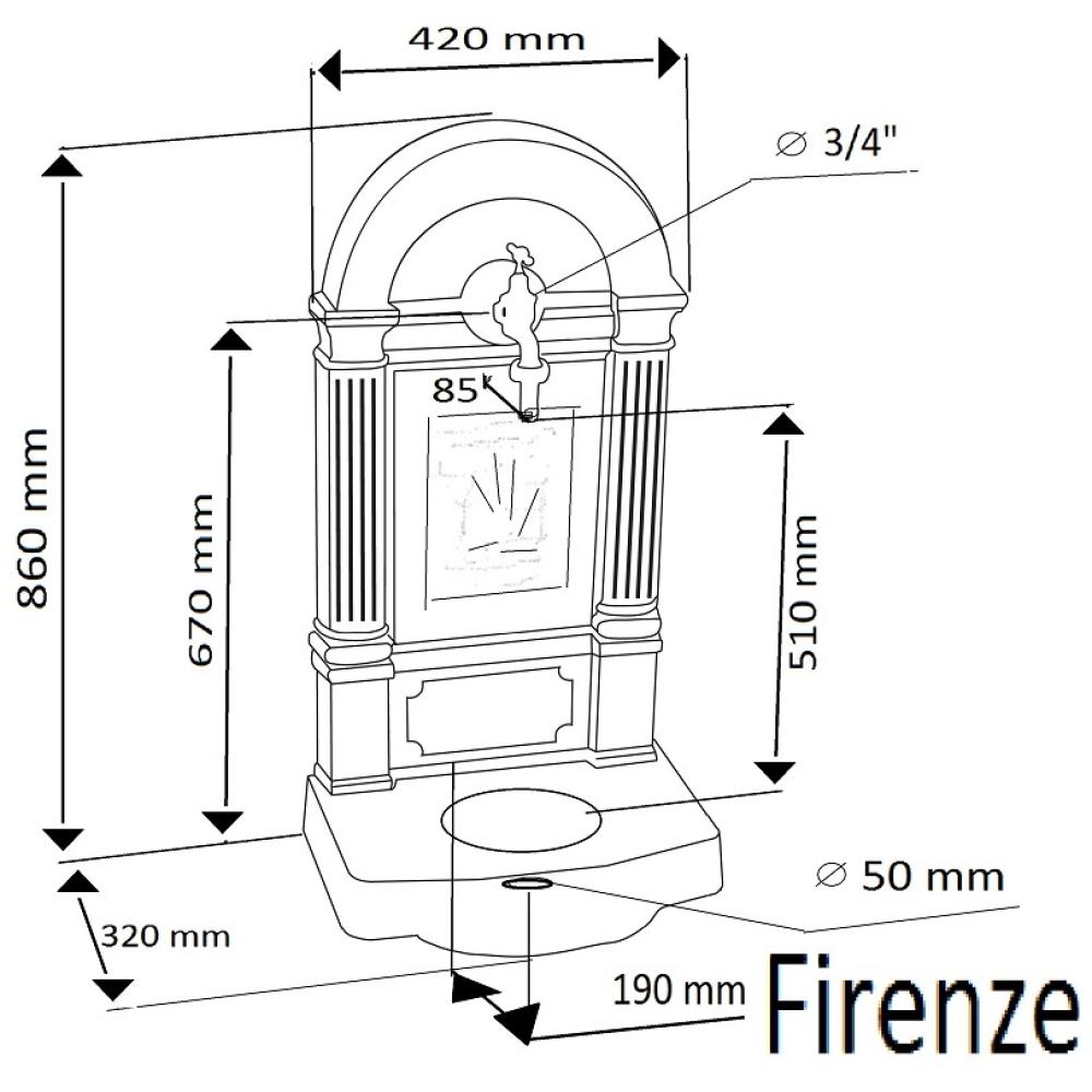 A Firenze álló falikút egy különleges kialakítású kerti kút, amely egyszerre állókút és falikút. A kúttest szabadon áll a talajon, de falhoz rögzíthető, így helytakarékos és dekoratív megoldás kültéri vízvételhez.