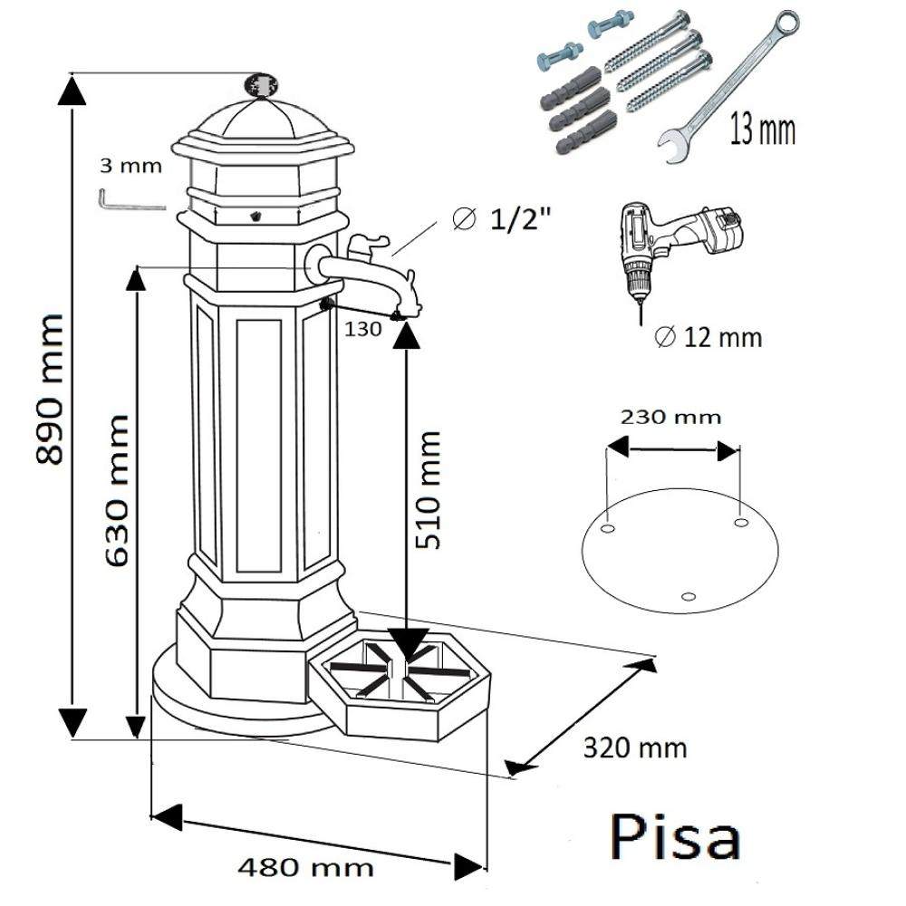 A Pisa állókút üreges alumíniumból készül, ennek köszönhetően masszív, mégis könnyen mozgatható és telepíthető.