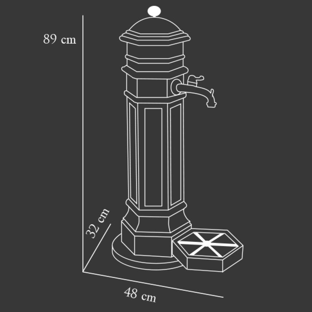 A Pisa állókút tartós, időjárásálló alumínium öntvényből készül. Ez a kivitel nem rozsdásodik, nem repedezik, így hosszú éveken át megőrzi eredeti állapotát kültéri használat mellett is.