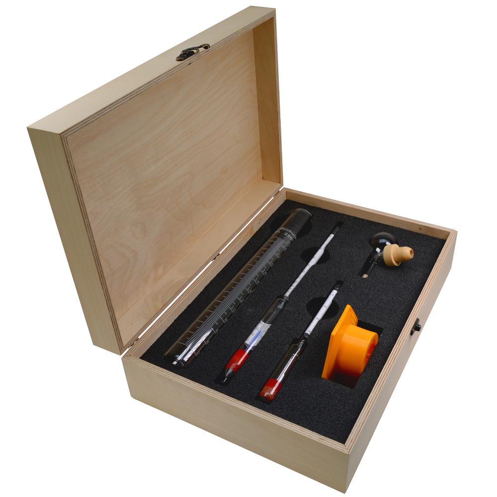 Hőmérős szeszfokolót, cefrefokolót, osztásos üveghengert és 50 ml-es italkiöntőt.