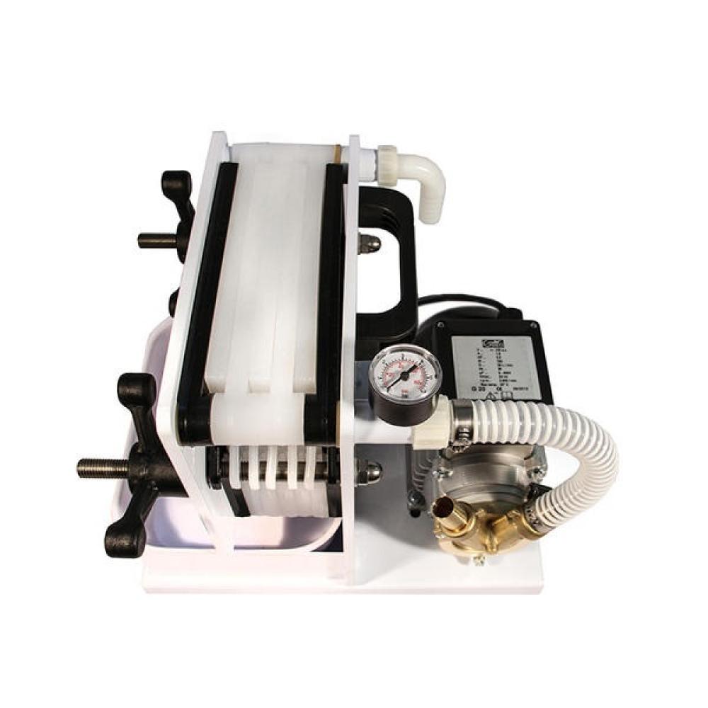 A Grifo FCH6 szűrőgép kompakt, nagy teljesítményű megoldást kínál házi és kisüzemi borászatok, likőr- és gyümölcslé-készítők, valamint kézműves kozmetikum gyártók számára. A zománcozott acélházas szerkezet strapabíró kialakítása és a 6 db 20x20 cm-es szűrőlap fogadására képes laptartórendszer biztosítja a sokoldalú használhatóságot. A szivattyúval ellátott szűrő a durva szennyeződések eltávolításától a teljes sterilizálásig képes a folyadékokat tisztítani, a felhasznált szűrőlapok típusától függően.