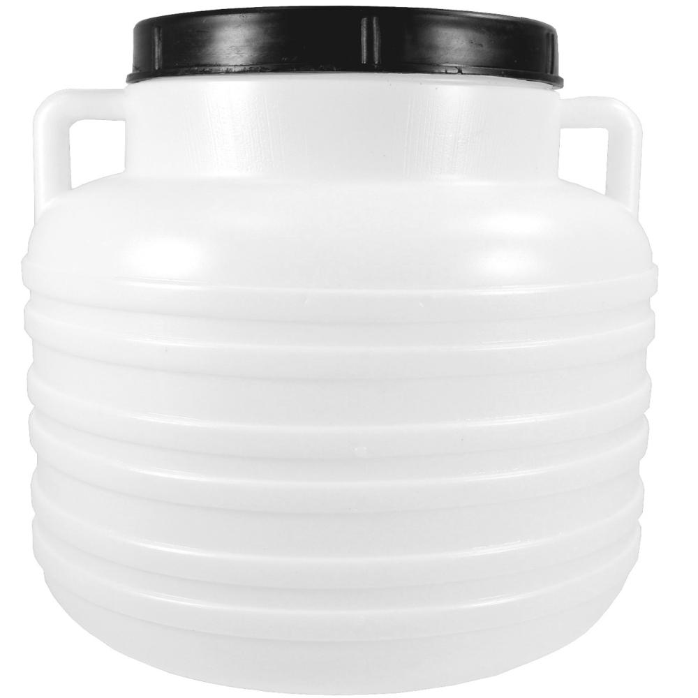 Bőszájú műanyag hordó menetes fedővel és fröccsentett emelőfüllel. Alkalmazható a zárt tárolásra és cefrézéshez.