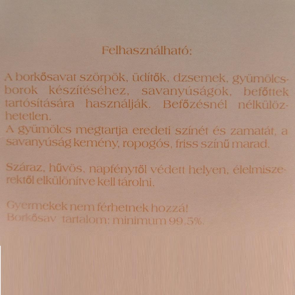 A Borkősav 10 dkg-os kiszerelésű természetes eredetű savanyító és ízfokozó anyag, amelyet elsősorban gyümölcsborokhoz, szörpökhöz, üdítőitalokhoz és savanyúságokhoz használnak. Javítja a termék sav-egyensúlyát, fokozza a frissesség érzetét, és segít a mikrobiológiai stabilitás fenntartásában. A borkősav a borban is megtalálható természetes sav, amely élelmiszerbiztonsági szempontból is kedvező választás.
