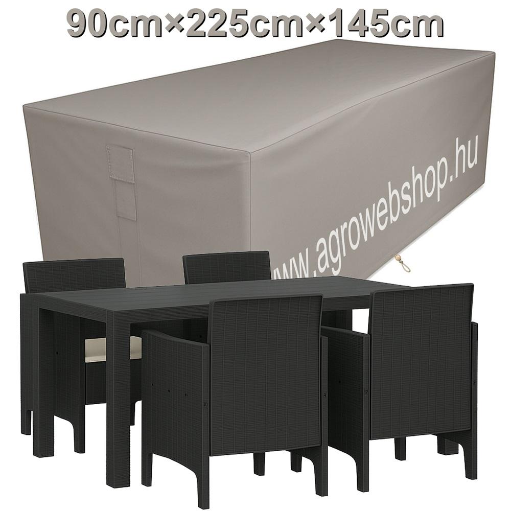 Ez a kerti bútortakaró ponyva UV-álló PE anyagból készült, **90×225×145 cm** mérettel, ideális nagy asztal szettek takarásához. A takaró ponyva taupe színben kapható, és peremben húzómadzaggal ellátott, hogy feszesen illeszkedjen és ne csússzon el szeles időben sem.