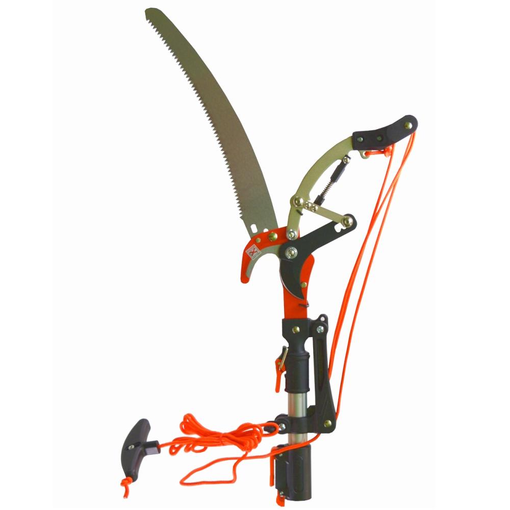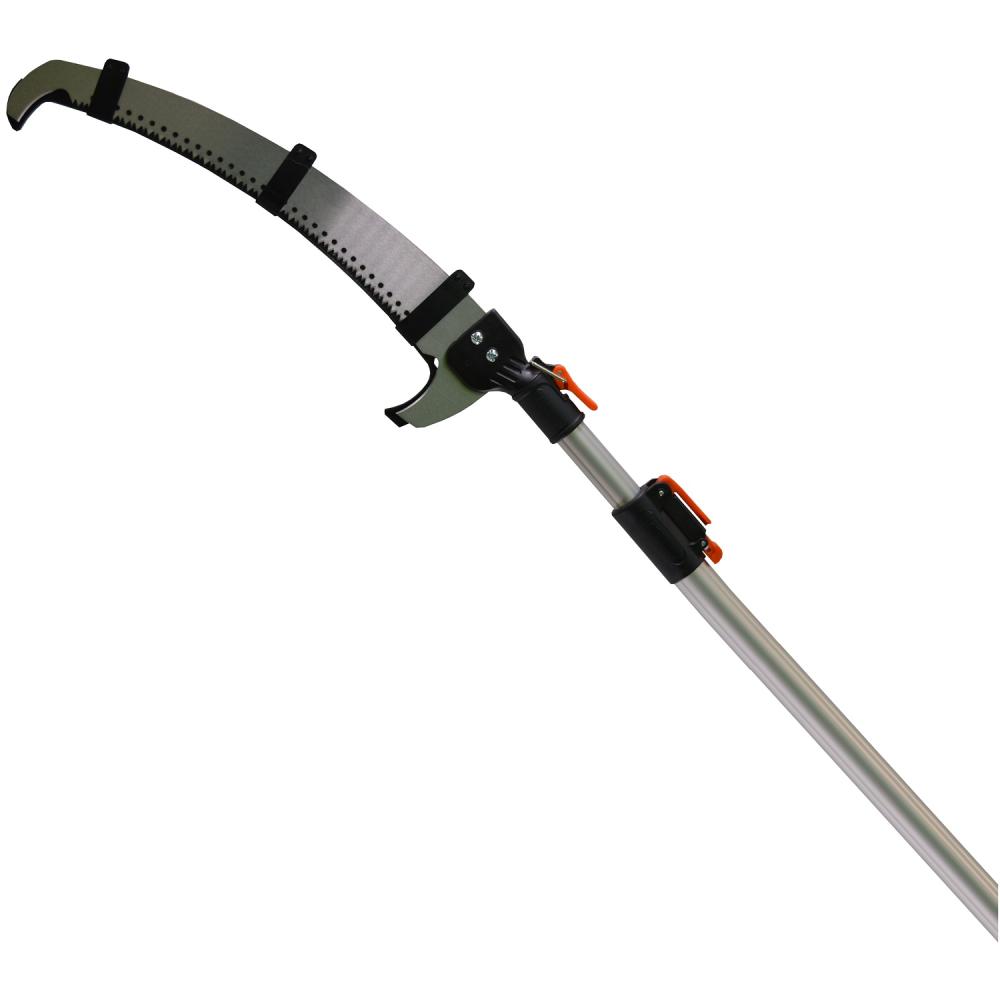 Igen, a teleszkópos nyél segítségével létra nélkül végezhető a munka, az ághúzó kampó pedig segít a levágott ágak irányításában.