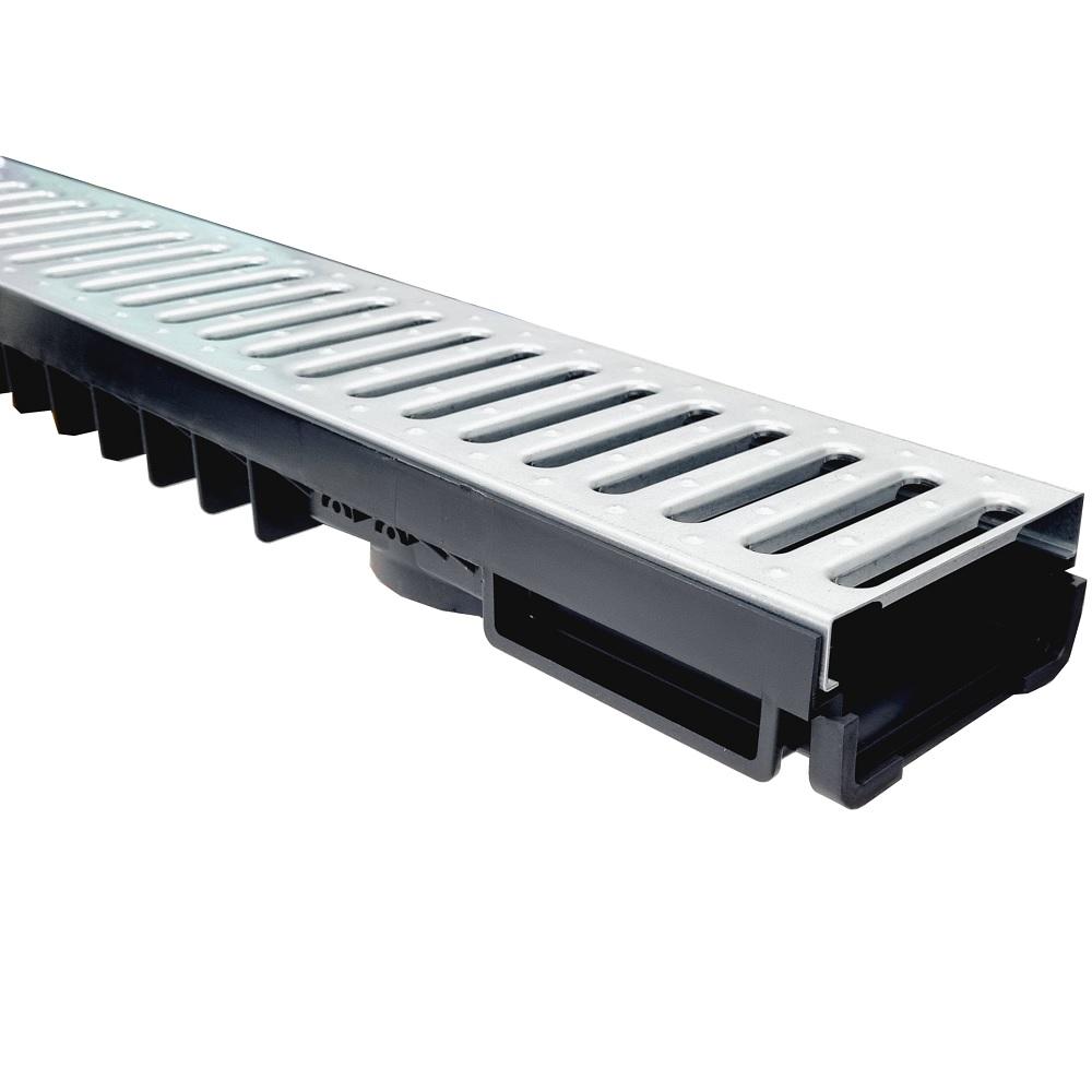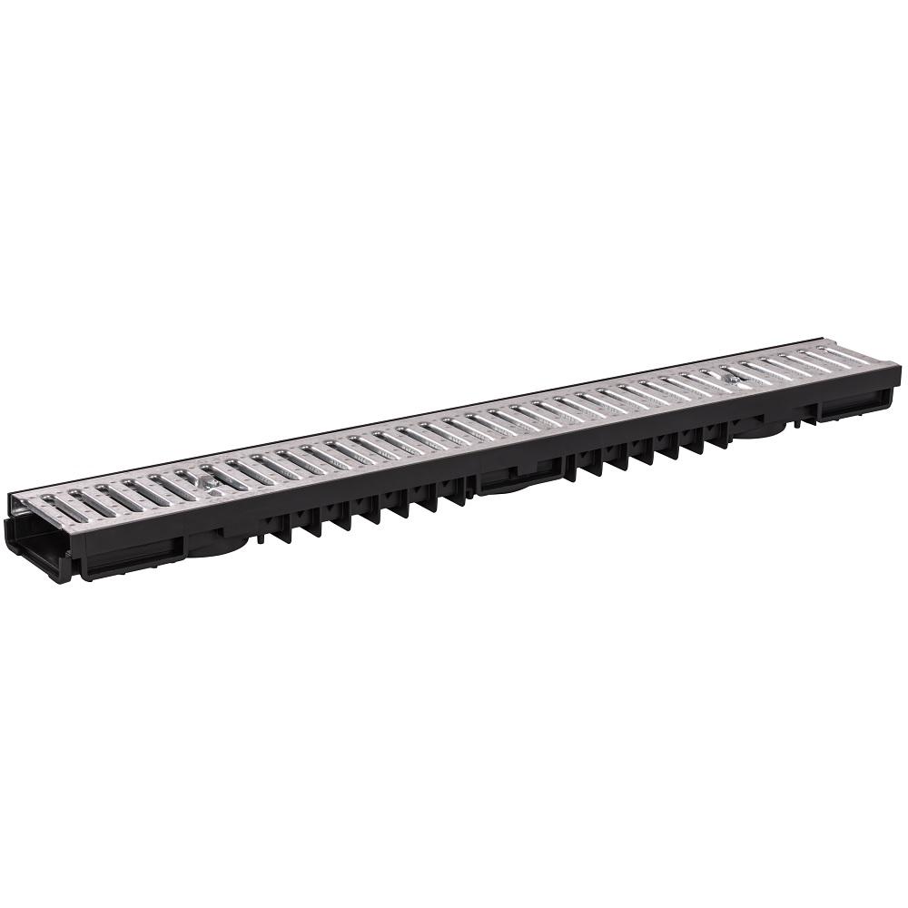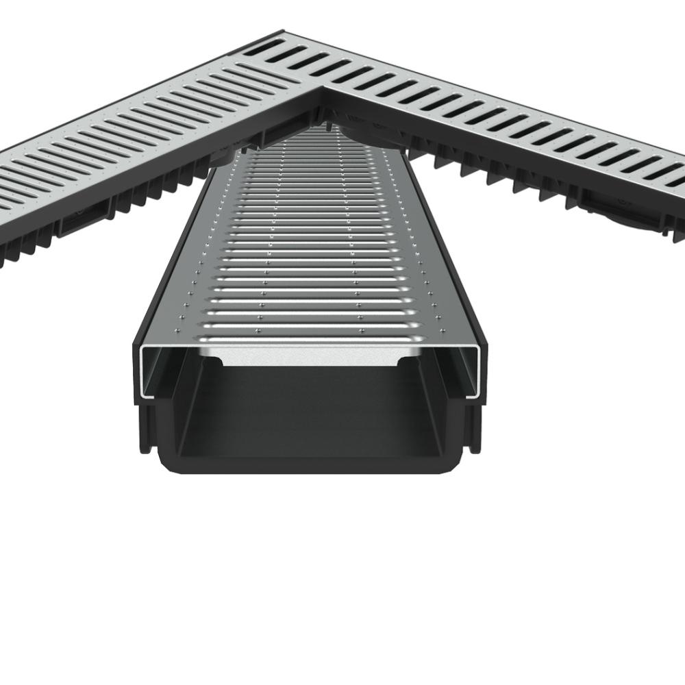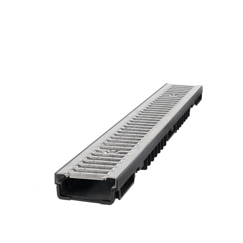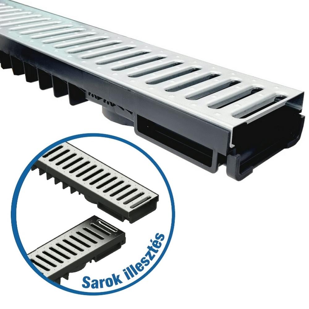 A Styron alacsony vízelvezető csatorna horganyzott fémráccsal ideális választás térkövezett felületekhez. A váz erős HDPE műanyagból készül, amely nagyfokú ellenállóságot biztosít az időjárási hatásokkal és a mechanikai terheléssel szemben. A horganyzott acélrács 500 kg terhelhetőséget nyújt, így a csatorna nemcsak gyalogosforgalom, hanem gépkocsival történő áthaladás esetén is biztonságosan alkalmazható.