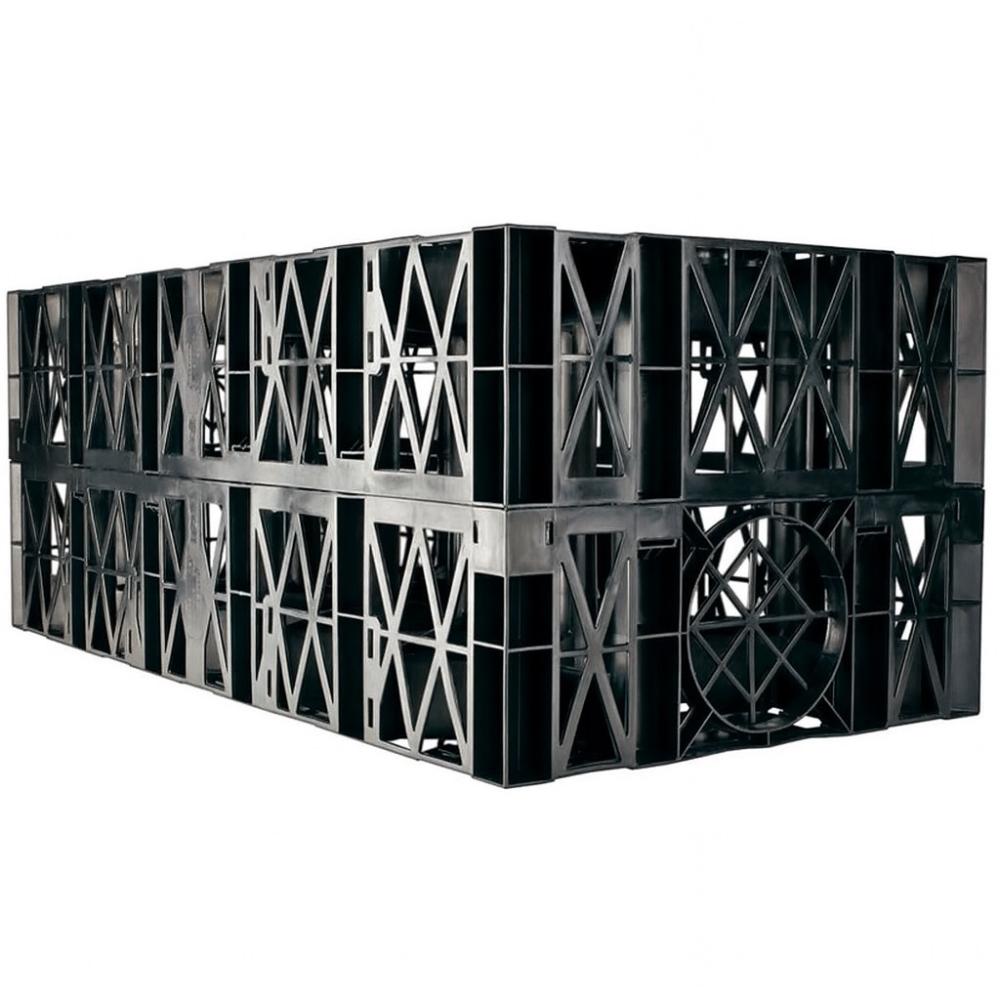 Anyag és felépítés. A szikkasztó blokk nagy teherbírású, időjárás- és fagyálló műanyagból készül, a bordázott rácsszerkezet pedig a szilárdság és a vízteret adó üregarány optimális egyensúlyát biztosítja. A moduláris felépítés előnye, hogy az elemeket egy ember is mozgathatja – nincs szükség nehézgépekre, a telepítés ideje és költsége így alacsony marad.