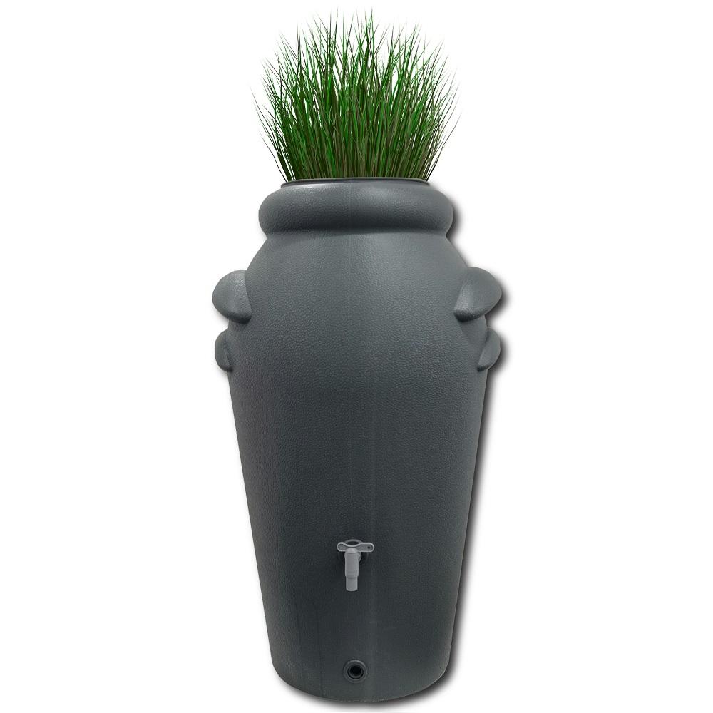 A szürke esővíztároló amfora 200 liter vizet képes tárolni, kisebb kertek számára ideális.