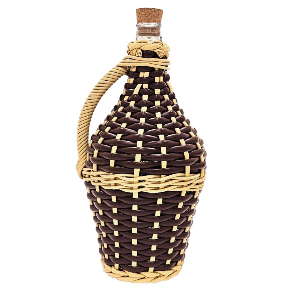 Olasz gyártású üveg demizson, PVC-vel fonott színes borítással. Demizsonüveg fehér, áttetsző, a ballonszáj mérete 16mm. A demizson PVC fonatú, hasonló hatása van mint a vesszőfonat lenne, csak sokkal tartósabb.  A termék sötétbarna vesszőhatású PVC fonott demizson.