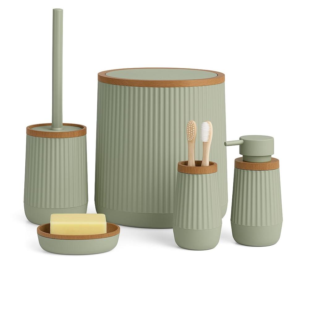 Fürdőszoba szett modern megjelenésű, letisztult kialakításával és praktikus használhatóságával tökéletes választás minden fürdőszobába. A tartós, könnyen tisztítható műanyagból készült szett harmonikus színeivel és természetes hatású részleteivel eleganciát visz a mindennapokba. Az összehangolt darabok nemcsak esztétikusak, hanem funkcionálisak is, segítenek rendben tartani a fürdőszobai eszközöket és higiéniai kiegészítőket.