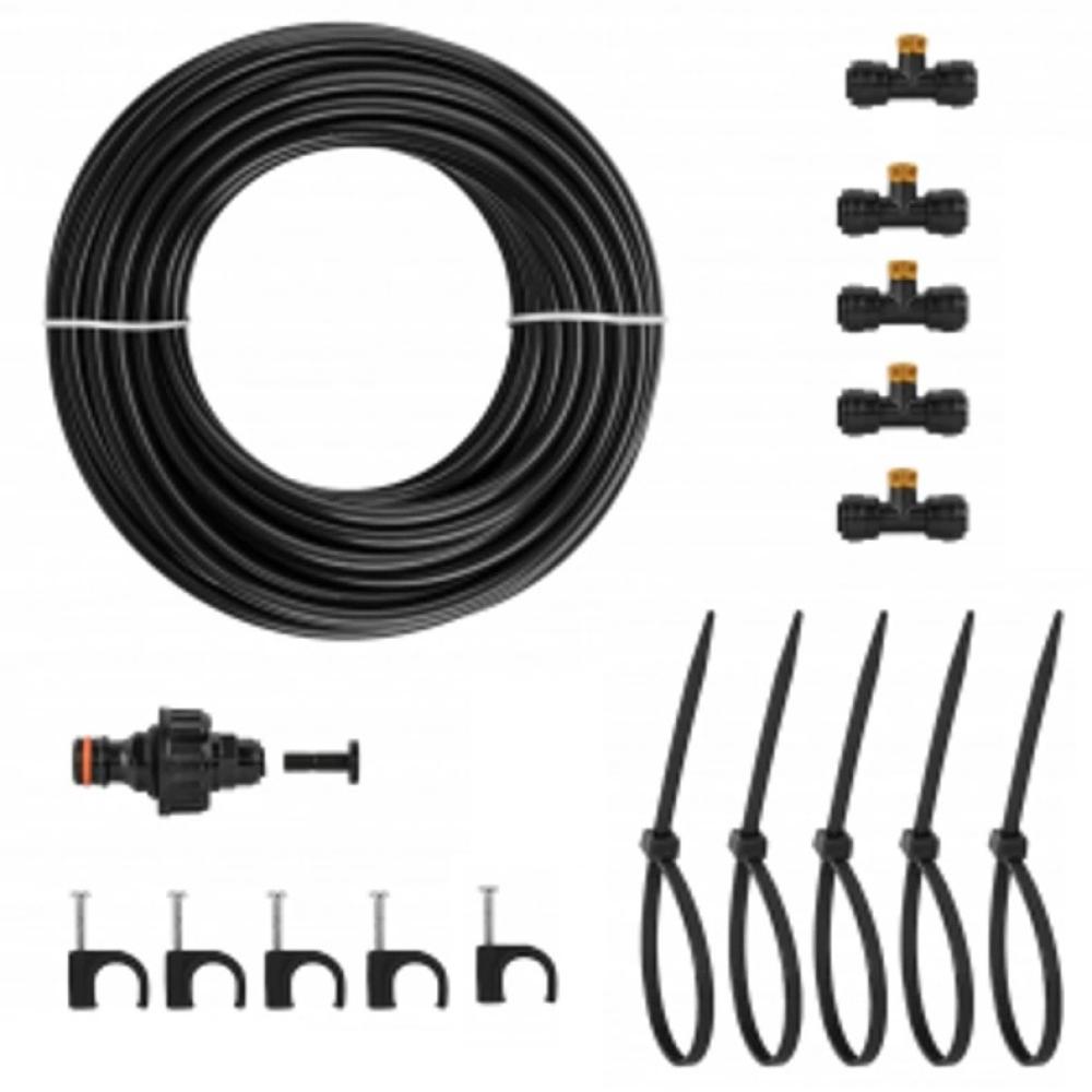 A 7,5 méteres prémium párakapu szett ideális választás teraszok, pergolák, kerti pihenők vagy vendéglátóhelyek hűtésére. A mikrocsepp technológiával működő fúvókák kellemes vízpermetet biztosítanak, amely hatékonyan csökkenti a levegő hőmérsékletét a legforróbb nyári napokon is.