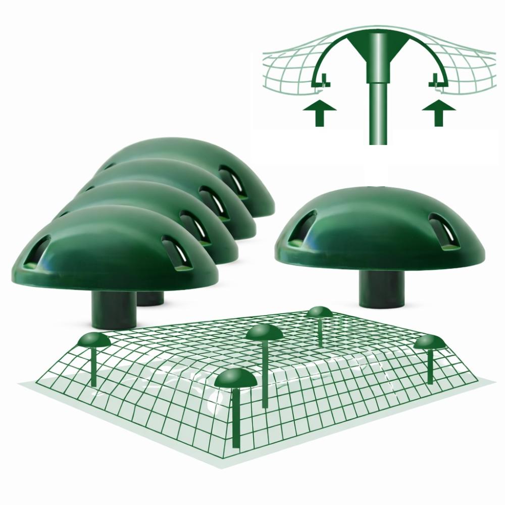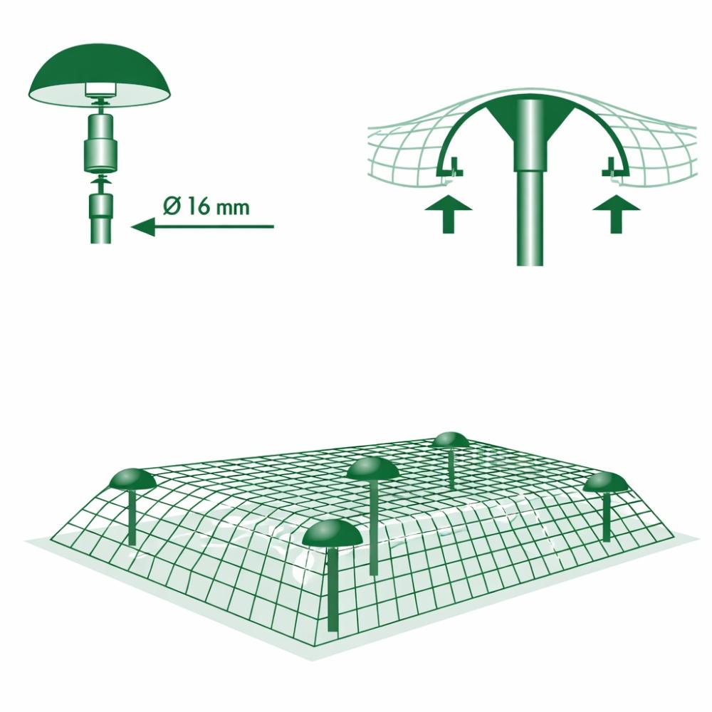 Nagyon hatékony készlet a madárháló vagy egyéb kertészeti hálo tartására. Előnye, hogy örök darab és nem szakítja ki a hálot. A magaság a növénytámasz magasásától függ. Elhelyezhető vagyis illeszthető a nálunk is kapható 16 mm átmérőjű növénytámaszhoz. Lásd a Kiegészítő termékeknél. A csomag 5 darab félgömböt tartalmaz.
