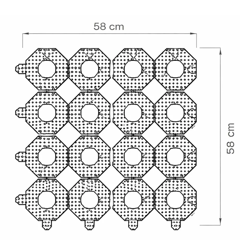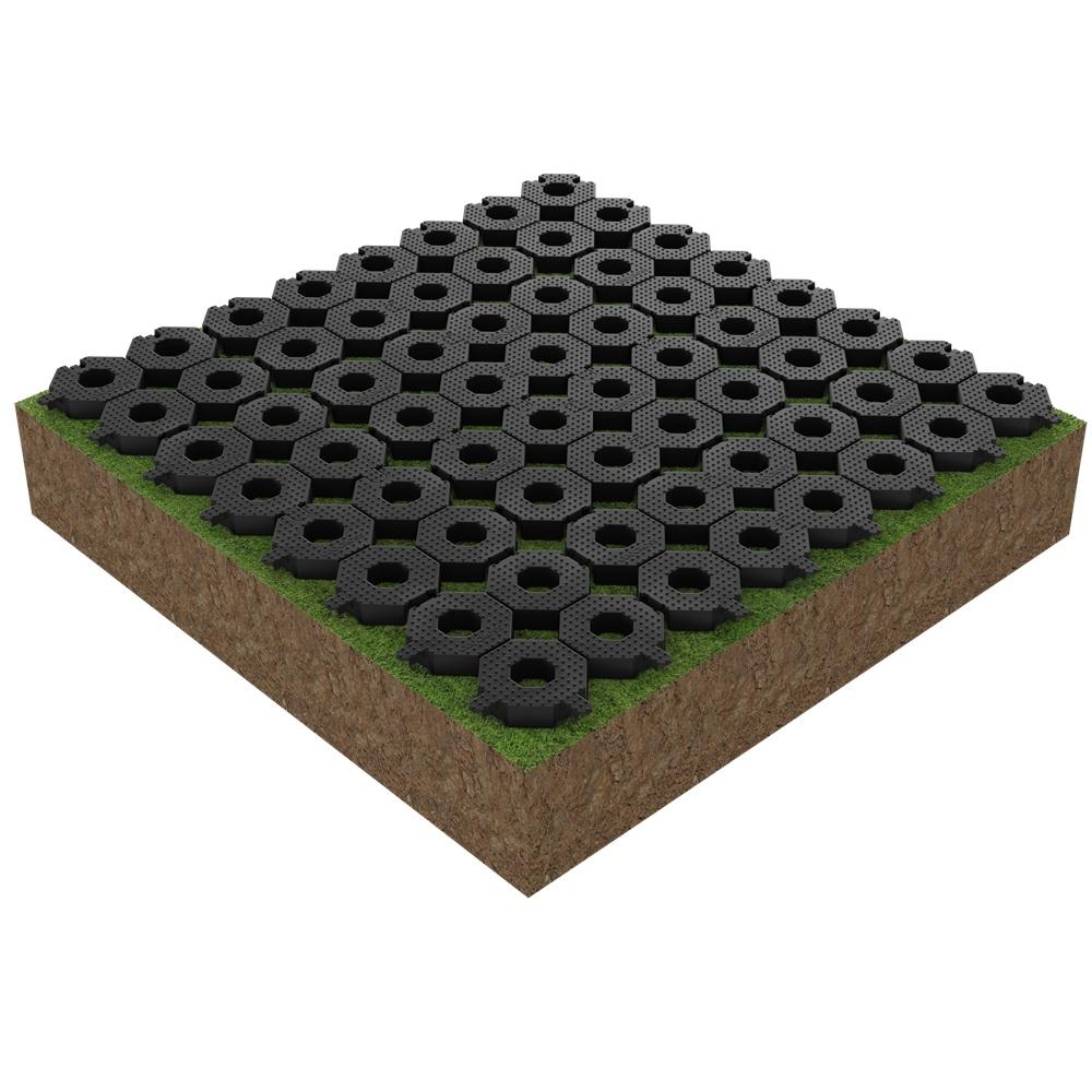 A Geocross alapanyaga a Gralene HD, amely egy nagy sűrűségű polietilén (HDPE) alapú, ipari minőségű műanyag. Ez az anyag kiemelkedő mechanikai tulajdonságokkal rendelkezik: nagy szilárdságú, ütésálló, ugyanakkor rugalmas, így kiválóan ellenáll a folyamatos terhelésnek és a környezeti hatásoknak. A Gralene HD alapanyag UV-stabilizált, így hosszú távon is megőrzi szerkezeti stabilitását, nem repedezik és nem válik rideggé még intenzív napsugárzás esetén sem. Emellett ellenáll a fagynak, a nedvességnek és a korróziónak, így kültéri felhasználásra ideális választás. A felhasznált alapanyag gyakran újrahasznosított polietilénből készül, amely nemcsak tartósságot, hanem környezettudatos megoldást is biztosít. Ennek köszönhetően a Geocross nemcsak nagy teherbírású és hosszú élettartamú, hanem fenntartható burkolati rendszer is.
