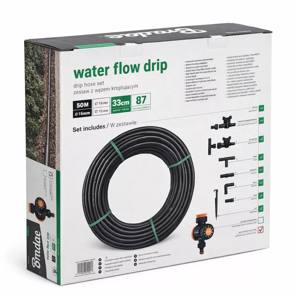 A Bradas Water Flow Drip csepegtető öntözőrendszer egy komplett, előre összeállított mikroöntözési megoldás, amely precíz és egyenletes vízellátást biztosít közvetlenül a növények gyökérzónájába. A rendszer ideális kerti, kertészeti és kisüzemi felhasználásra, ahol fontos a víztakarékosság és a kontrollált öntözés.